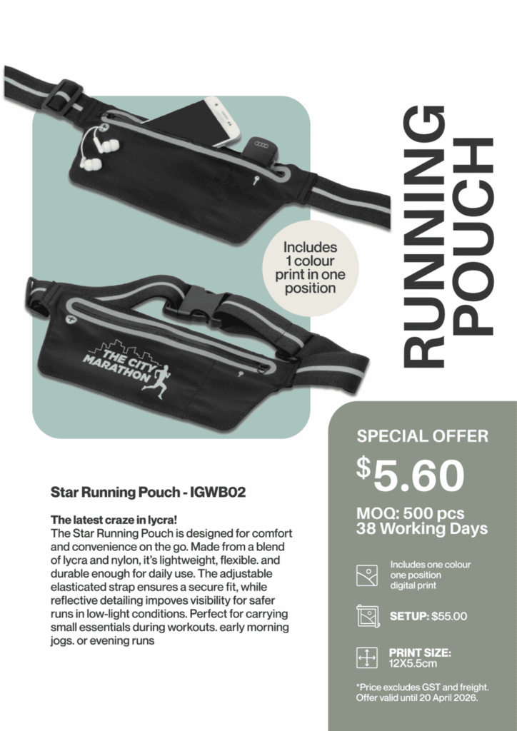 Do not miss out on this opportunity to provide a high-value gift that your clients will actually use. Contact the Minc Marketing team today to place your order or request a digital mock-up of your logo on the Star running pouch.